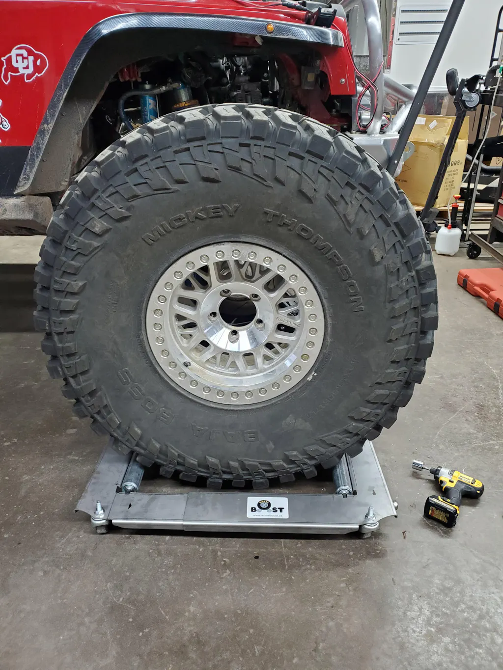 Now available for delivery! The Wheel Boost WB-32-48-SS, "Monster Truck" edition, (For Tire Diameters from 32 - 48") is designed for the serious Off Road Enthusiast. The rollers are 16" long and the load rating is 200 pounds (90 kgs.). Changing your wheels is a one man job with this heavy duty tool.
